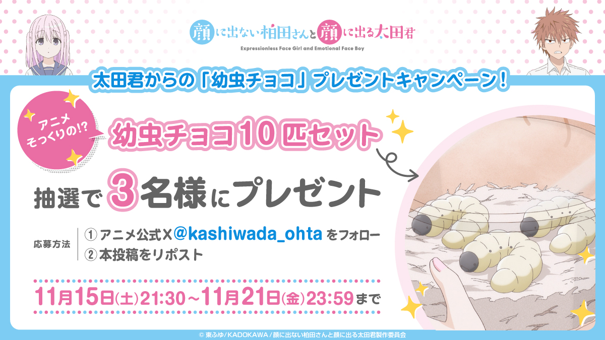 TVアニメ『顔に出ない柏田さんと顔に出る太田君』公式Xアカウントでは、本日11月15日(土)から幼虫チョコ10匹セットのプレゼントのフォロー&RPキャンペーンを実施いたします。